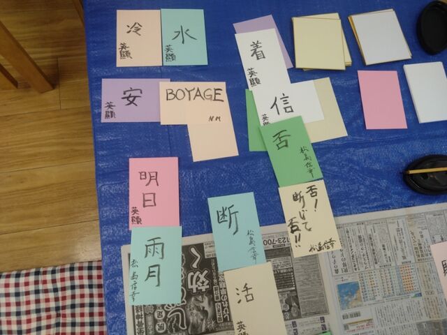 参加者は男性が2人だったのですが、最初は何を書こうか悩んでる感じでしたが、ひとつ書き始めると次から次へと言葉が浮かんできたようで、カラフルな紙に様々な文字や言葉が並びました。
