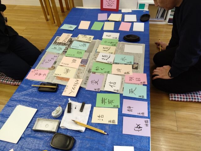 墨を擦り、心を落ち着けてから、好きな色の紙に筆で好きな言葉やこころに浮かんだ文字を書いてもらいました。
